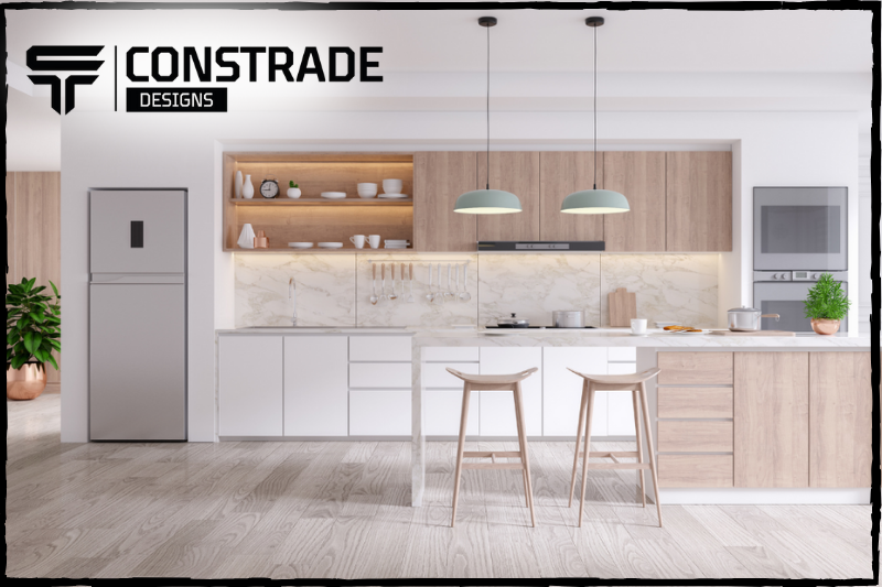 اختيار الخامات المناسبة: تحديد المواد المستخدمة في التصميم مثل الخشب، المعدن، أو الرخام مهم لضمان المتانة وسهولة التنظيف، يجب أن تكون هذه المواد مقاومة للحرارة والرطوبة.