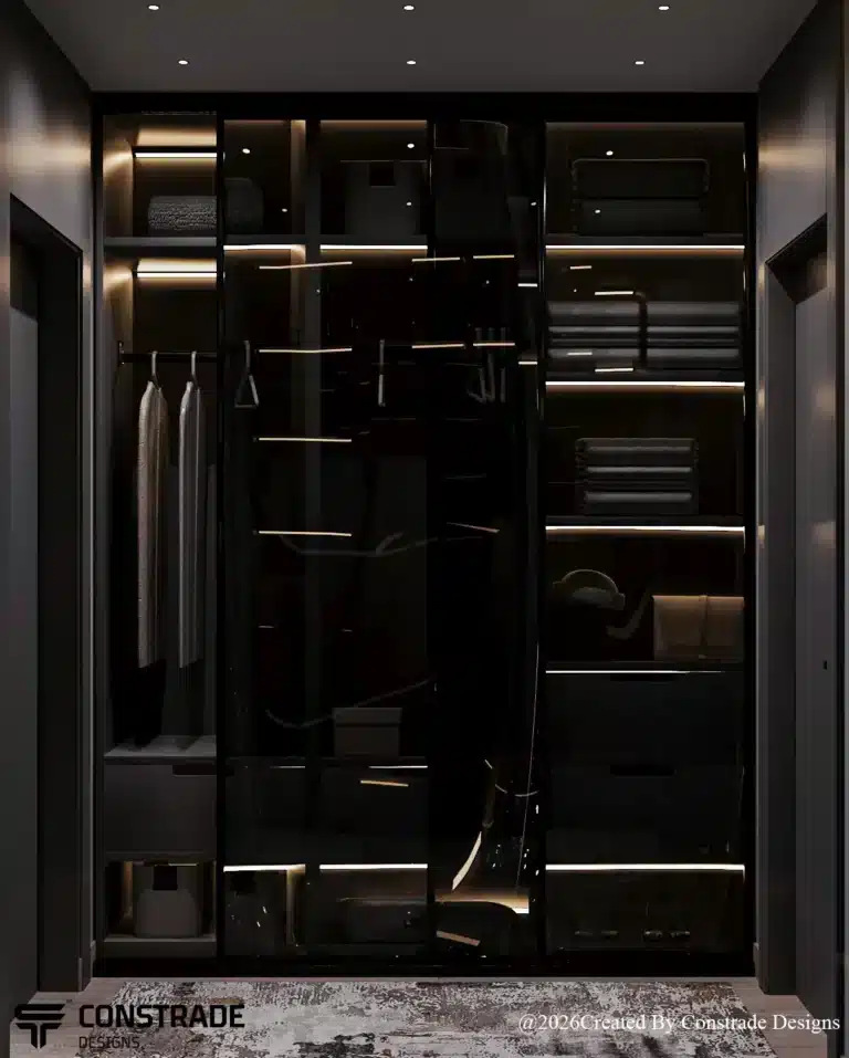 • دولاب ملابس مدمج بأبواب حديثة توفر أقصى استفادة من المساحة.